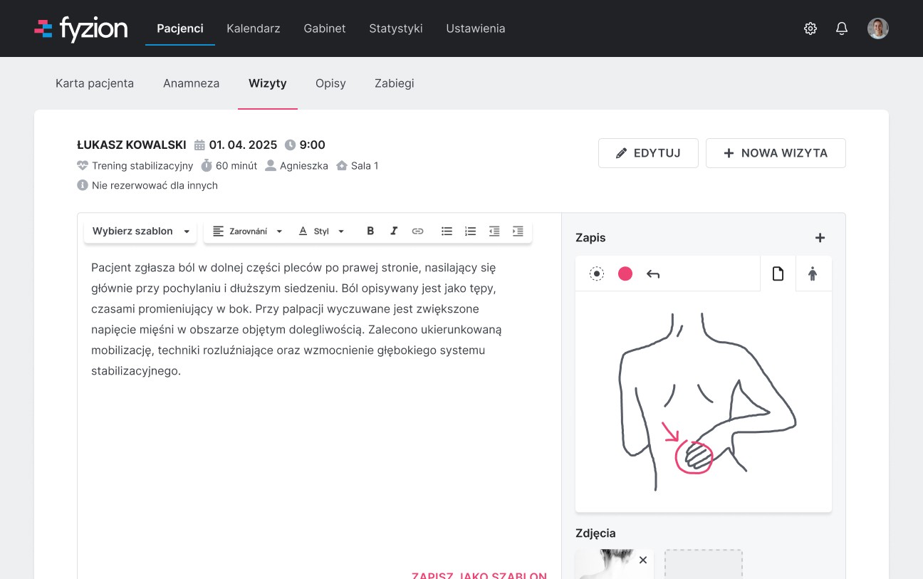 Muszę też pochwalić obsługę klienta — niezależnie od tego, z jakim pytaniem czy problemem się zgłaszałam, zawsze spotykałam się z życzliwym podejściem, a co najważniejsze: zawsze potrafili mi pomóc. Bardzo podoba mi się możliwość dodawania zdjęć i szkiców do karty pacjenta — korzystam z niej regularnie. Zachwyca mnie również to, jak Fyzion nieustannie się rozwija.